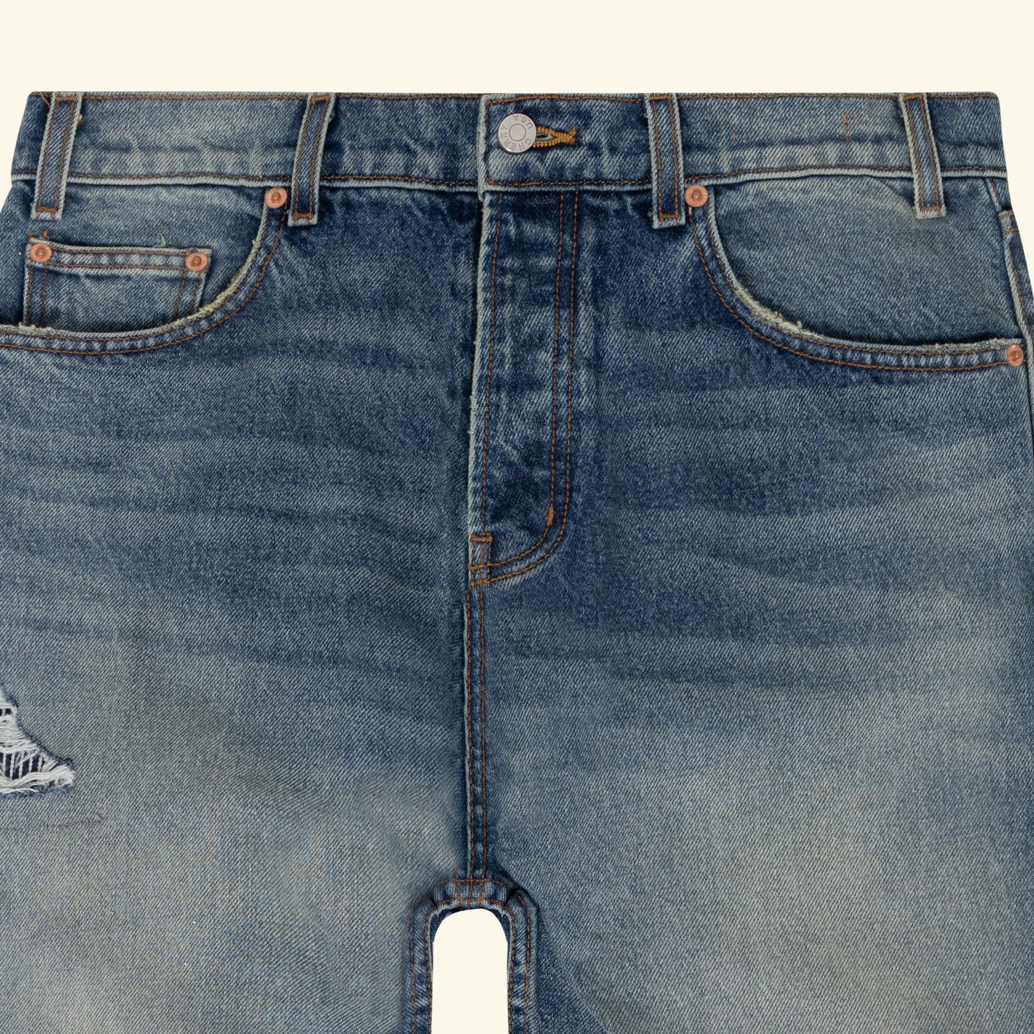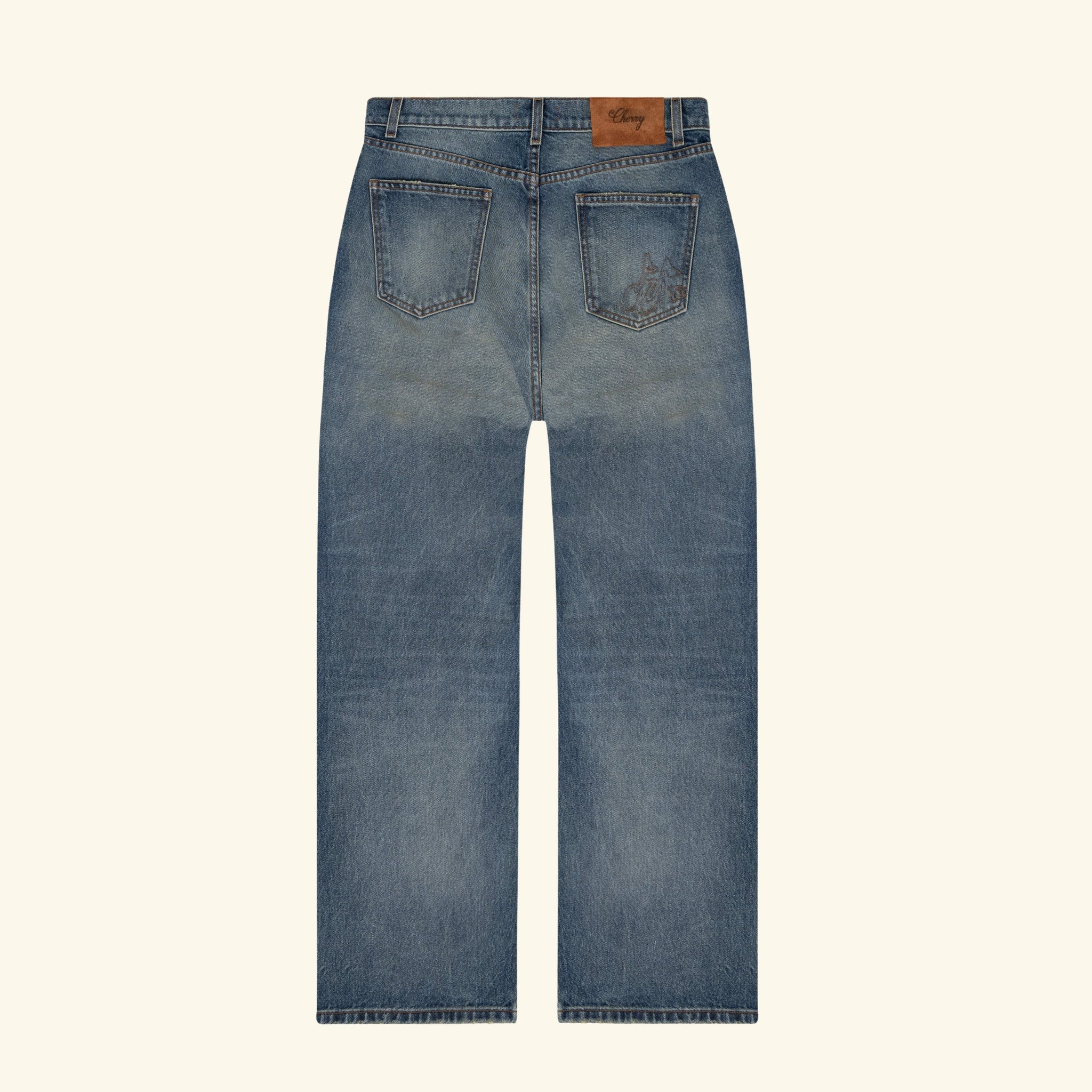 Sweet Tooth Paint Splatter Denim Pant. Paint detailing on legs. Running stitch Cherry Logo hit on back right pocket.