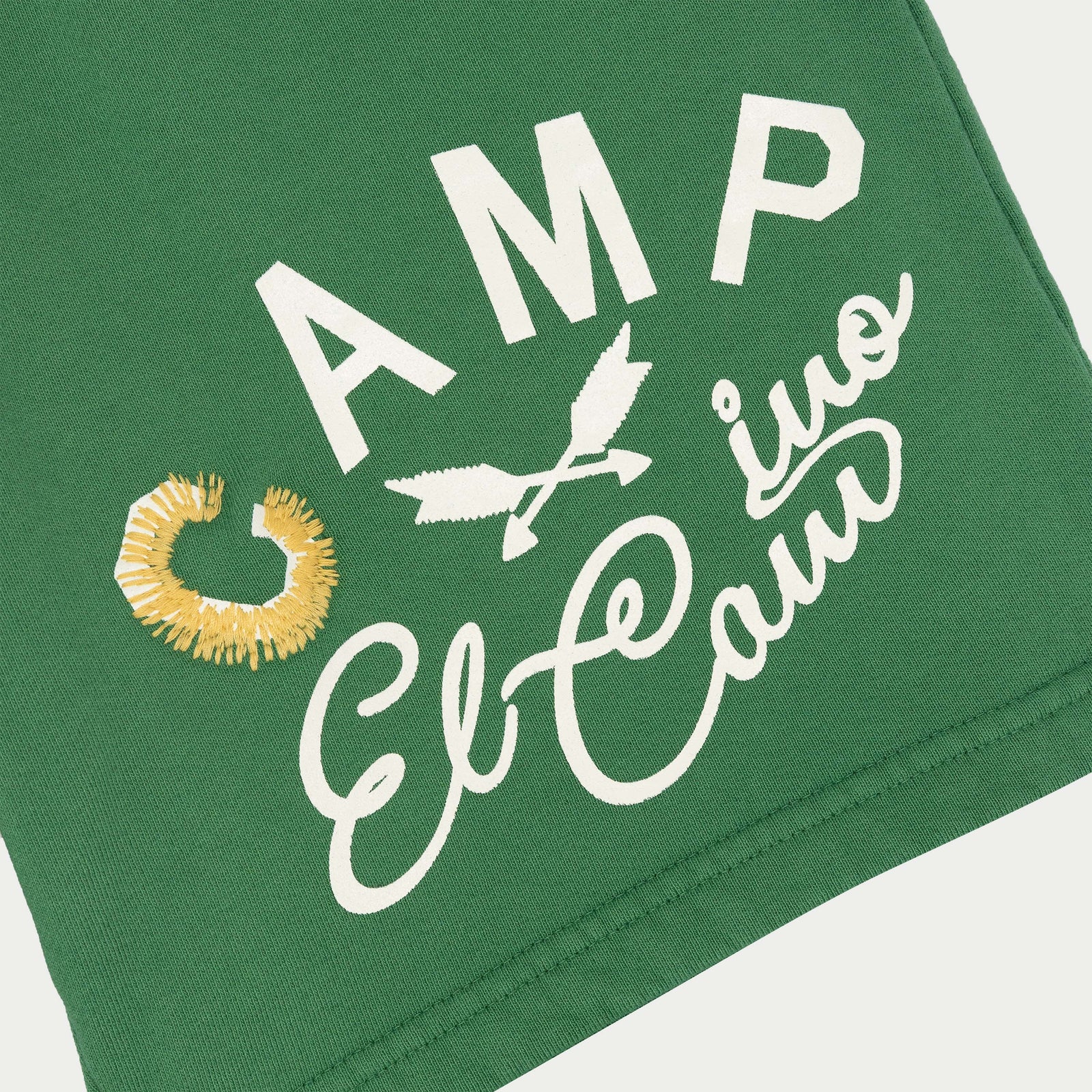Camp El Camino Logo shorts in kelly green. Jumbo graphics printed in white throughout.